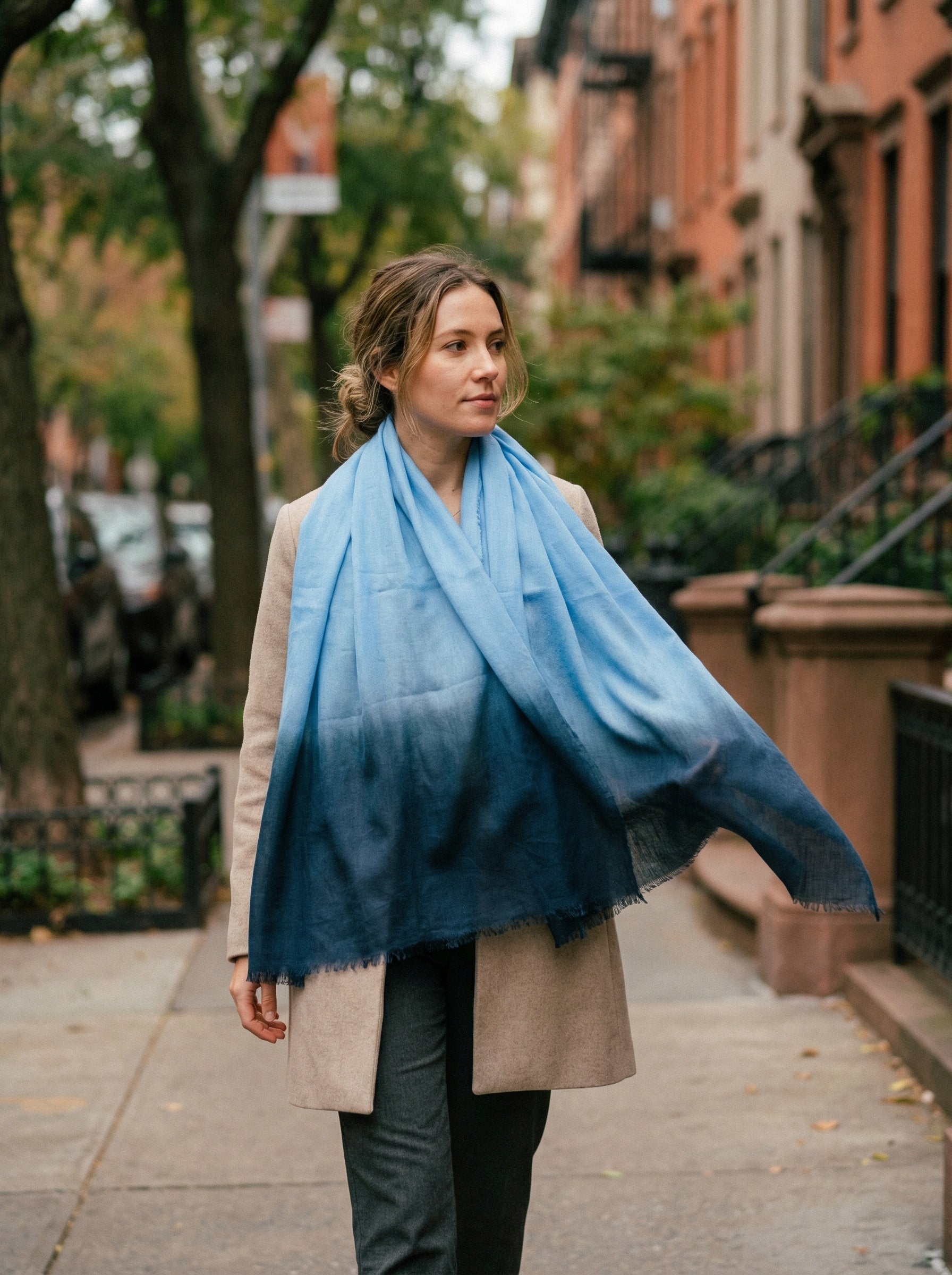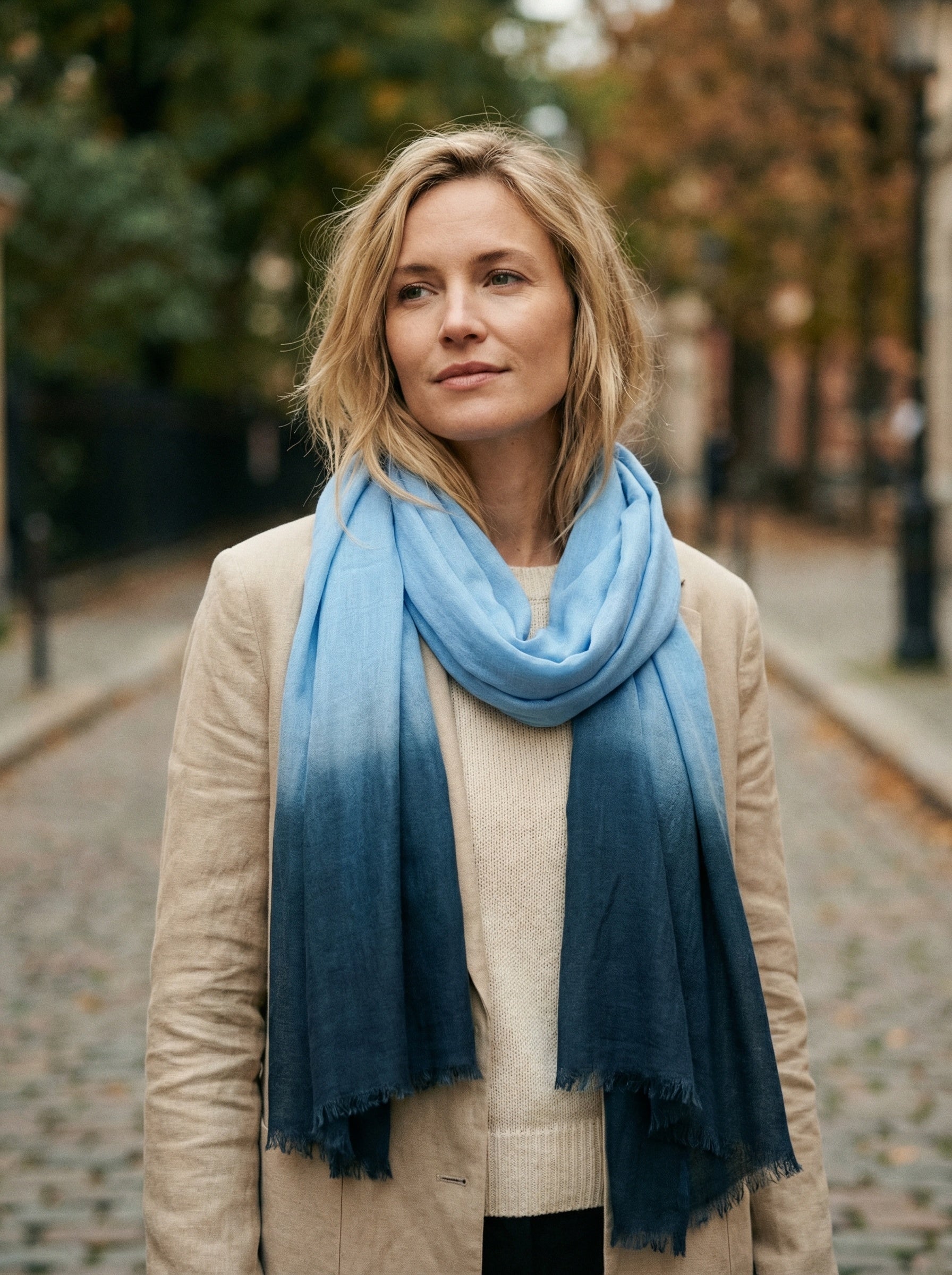 Bereichern Sie Ihre Kollektion mit dem hellen Himmelblau – einem puderblauen Schal, der den azurblauen Himmel Marokkos widerspiegelt.